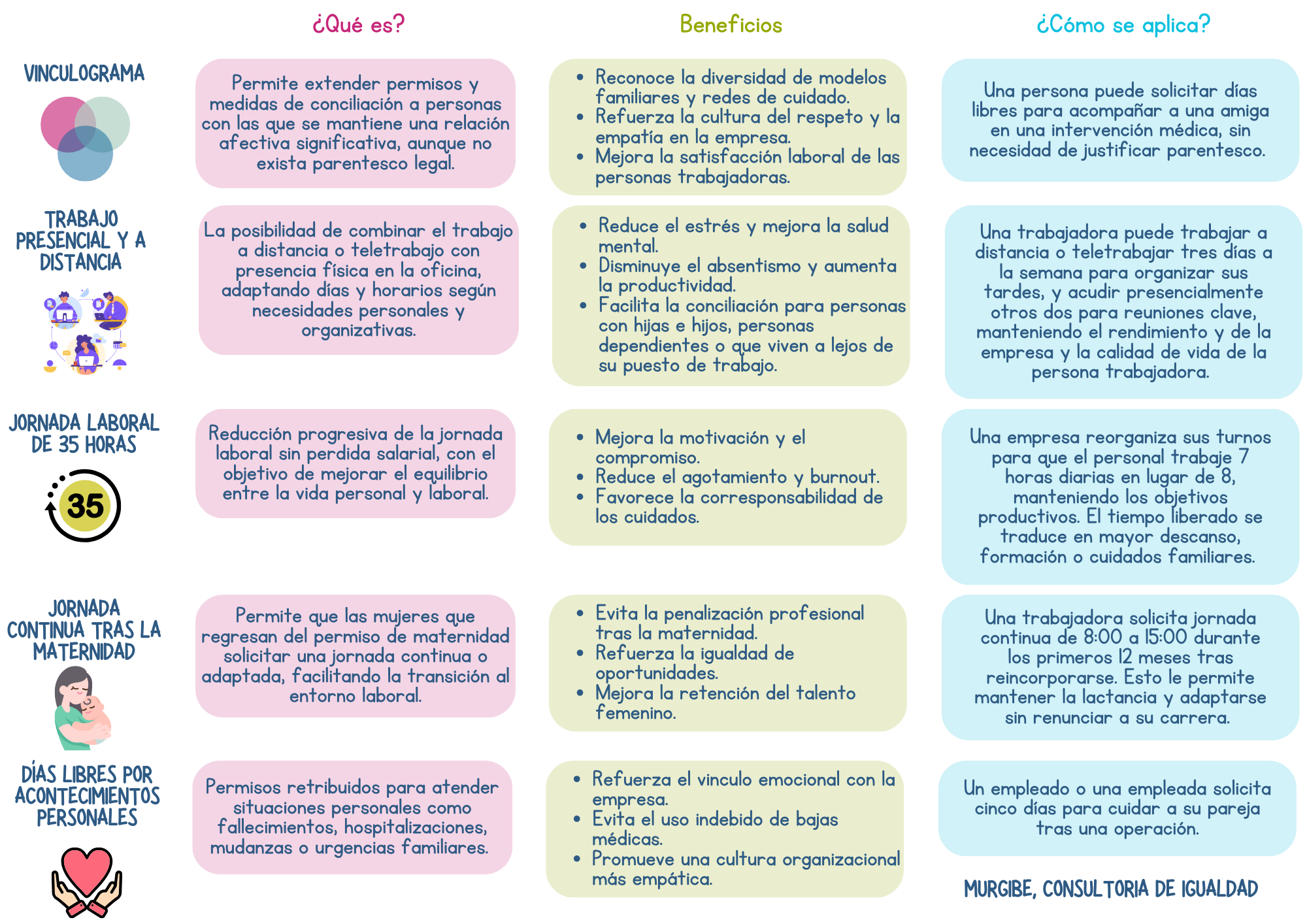 Por ello proponemos un breve listado de medidas que reflejan las posibilidades y oportunidades a nivel organizacional para poder gestionar la vida laboral, familiar y personal de las personas trabajadoras y establecer así una relación laboral basada en una cultura adecuada a las nuevas demandas, intereses y realidades. Estas medidas no solo cumplen con la normativa vigente, sino que transforman la cultura organizacional hacia modelos mas sostenibles, inclusivos y humanos.